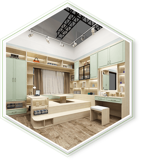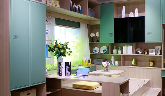 在视觉效果上,卡尔文以素雅的鹂香桐搭配时尚的黑铝框和原木色柜体,沉稳不失灵动;并融入智能遮窗帘、电动升降台、智能魔镜等功能;以书桌、衣柜、梳妆台和榻榻米的结合,实现读写区、梳妆区、收纳区功能,让空间的使用率高达90%!
