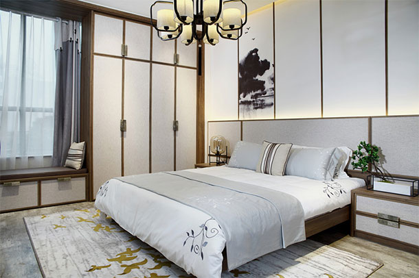 水墨画护墙系统,防潮隔音,塑造安静的睡眠空间环境;空间中床、柜、墙融为一体,形成统一的家居风格,营造舒适的视觉体验。