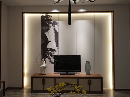 新中式客厅贵在删繁就简,其格调典雅质朴,色彩稳重自然,大量的留白与水墨画元素的双层客厅护墙系统,充分体现了中国传统美学的精神,散发出亦古亦今的层次之美。