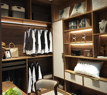 遵循整体的中式对称设计,以流畅线条搭配玻璃门板,打造出视觉通透且高挑的储物空间,合理的柜格分区,能实现将衣物整齐有序地分门别类。衣帽间可根据户型特征,选择与卧房相通或单独存在。