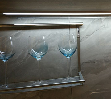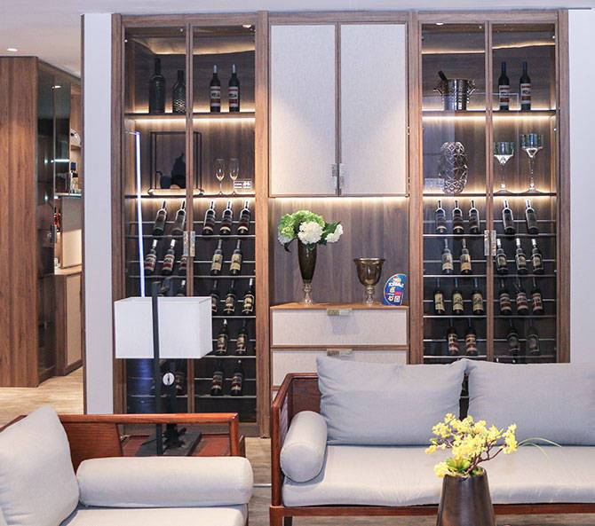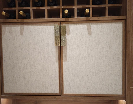 入墙到顶式酒柜设计,不放过一丝可利用的空间,打造强大的收纳功能,同时,玻璃门板与亚麻布纹饰面板相结合,时尚与大气兼备,透过玻璃柜门,藏酒便成了展示的艺术品,突显主人品位。