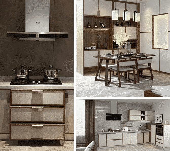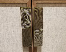 3、具备中国古典元素的对称古铜拉手,造型简洁大方,与亚麻布纹饰面门板完美配套,成为整体的点睛之笔。
