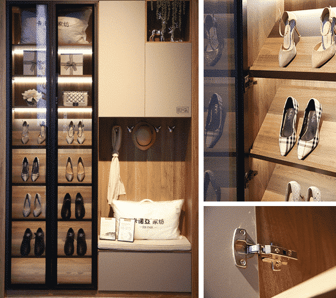 鞋柜与休闲区融为一体,高达四五米的护墙显得十分大气,而且设计十分人性化,收纳功能强大,玻璃面板让视线一目了然。