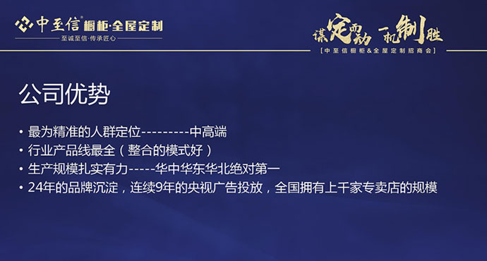 中至信优势:最为精准的人群定位、行业产品线最全、生产规模扎实有力、24年的品牌沉淀,连续9年的央视广告投放、全国拥有上千家专卖店的规模