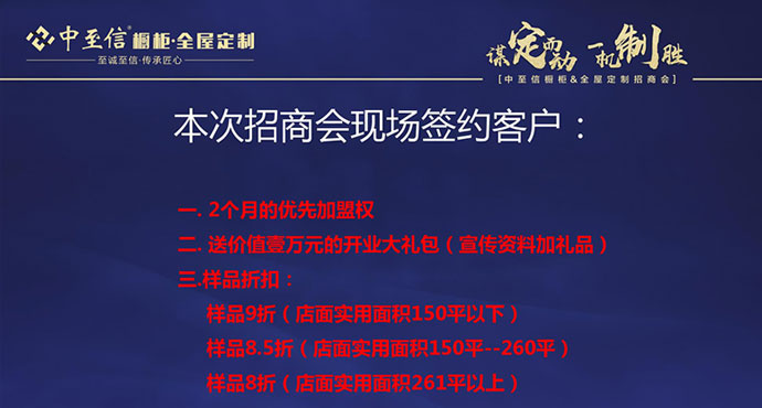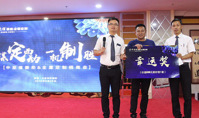 2个月的优先加盟权、送价值壹万元的开业大礼包、样品折扣、现场签约抽红包……现场一系列的加盟福利引爆全场,来宾们对中至信的企业实力信服不已,签约、交付定金一气呵成,现场签约成功率再创新高。祝贺中至信新晋加盟的城市合伙人!相信他们定能跟随中至信家居,谋定而动、一机制胜!
