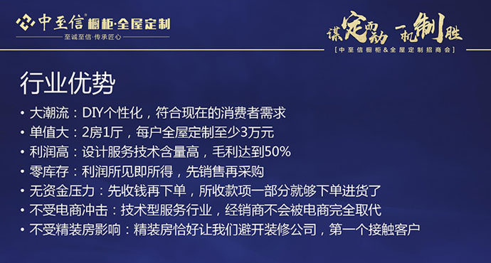 行业优势:大潮流、单值大、利润高、零库存、无资金压力、不受电商冲击、不受精装房影响