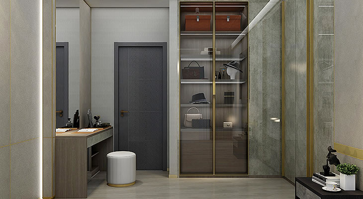 诗尼曼新品-轻奢·博纳尔系列:威廉灰橡柜体板,低调的纹理彰显雅致,银岩灰与幻影黑有层次感的花纹在亮面的加持下更显精致耐看。K框玻璃门一门到顶的设计搭配内嵌灯,尽显低调奢华。大面积色块搭配的设计手法,以小面积的金属色点缀,整个空间整洁又精致,体现了都市高品位的艺术生活。