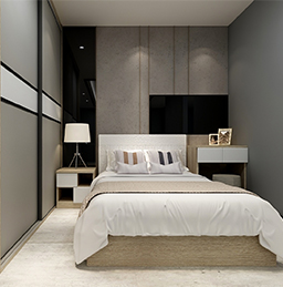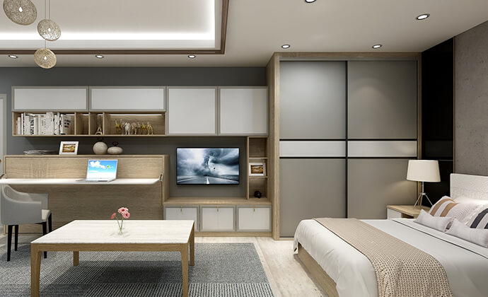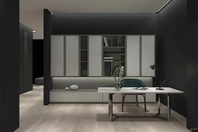 护墙系统的介入,与到顶衣柜门相呼应,衣柜、书柜、梳妆台一体化设计,节省空间。