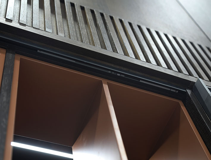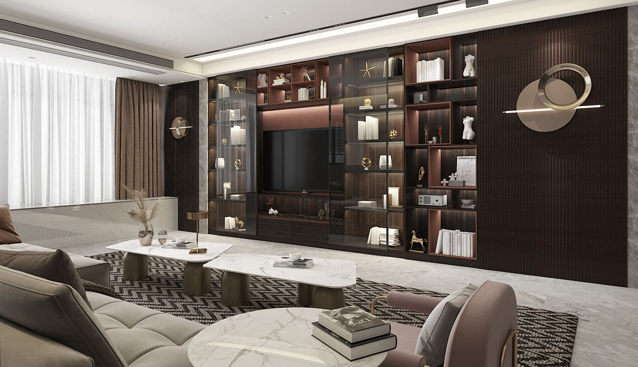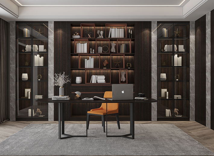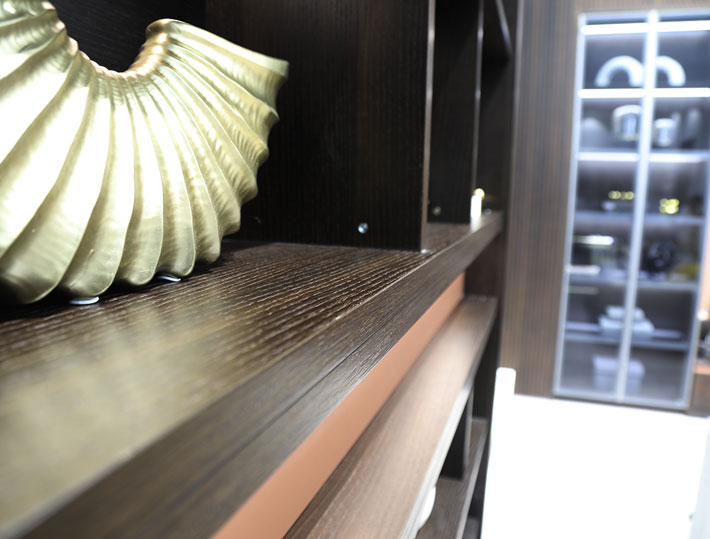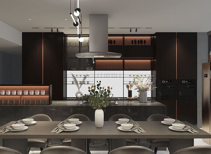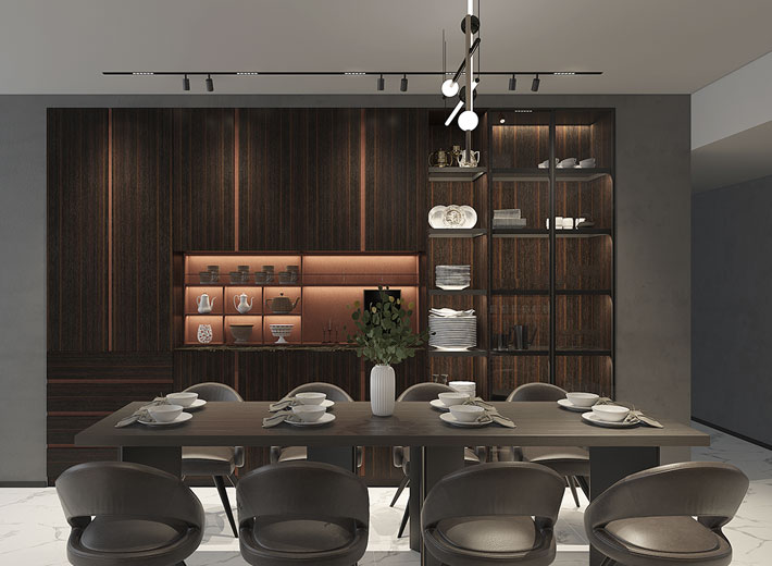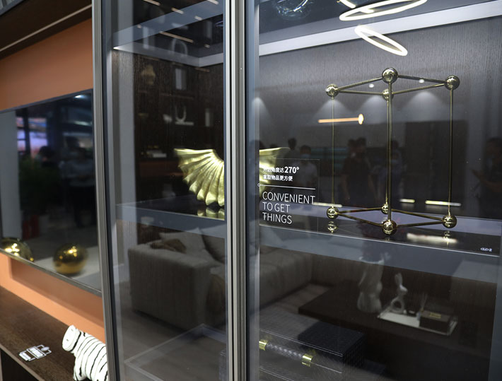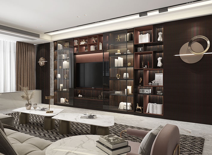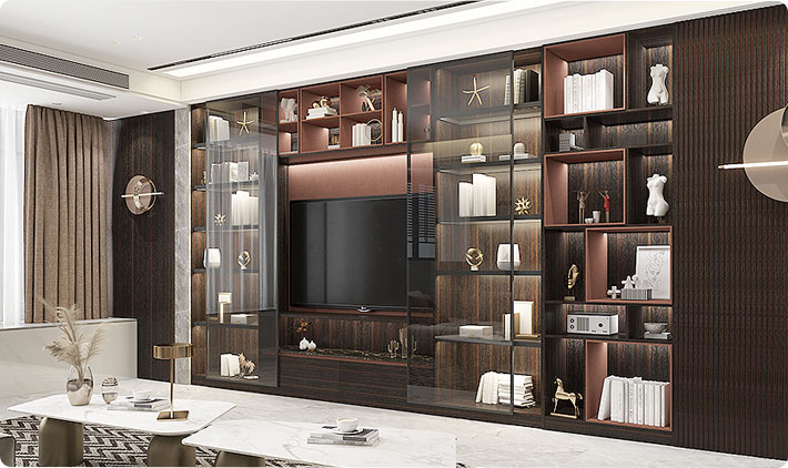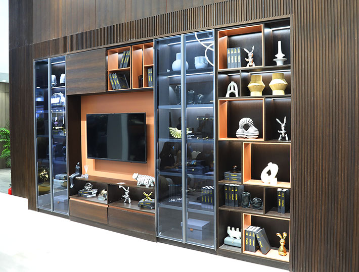 收纳区门板采用兔宝宝铝框玻璃门制作,凸显柜体的现代感,视觉上的硬朗感受与家居氛围融为一体,不仅起到收纳的作用,还可以起到观赏的作用;内部设计有嵌入式智能感应LED灯带,采用超窄无光点的设计,照明时长可达50000小时,既可为家具照明使用,同时又是家具装饰的好伴侣。