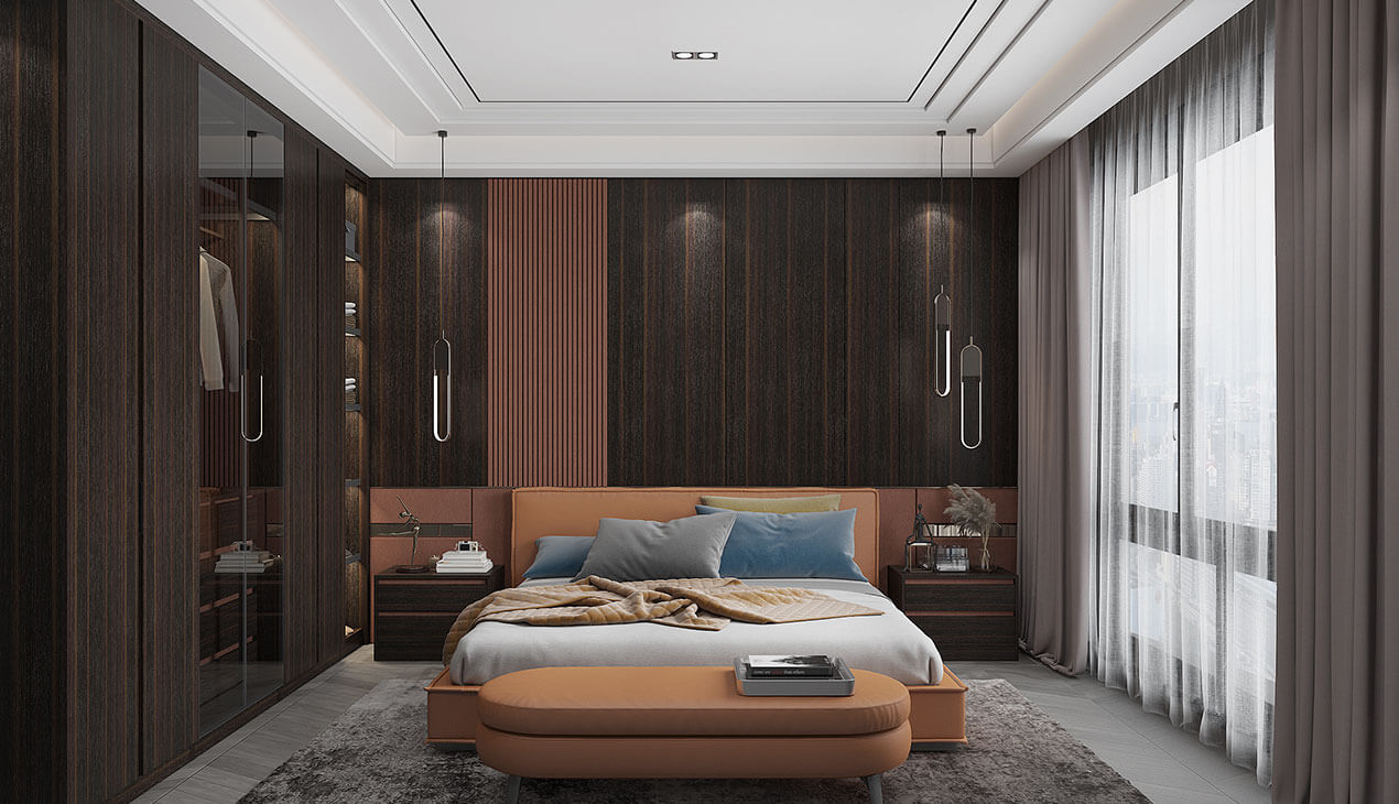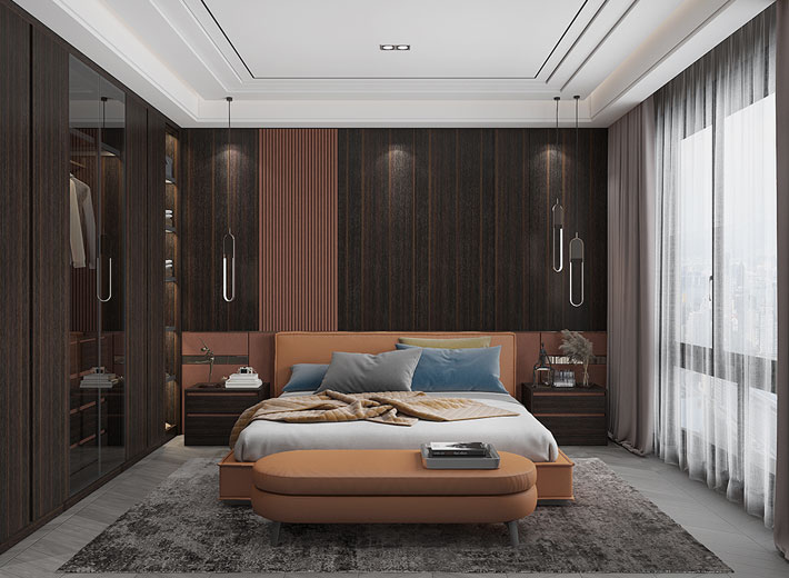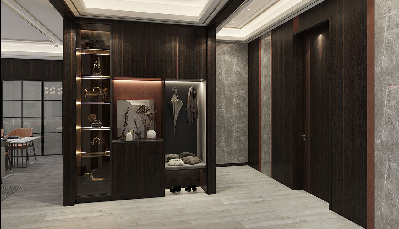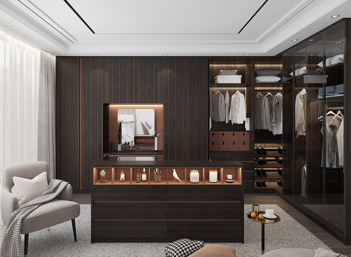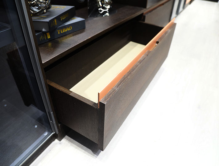 兔宝宝健康家居西尼尔·赤霞系列,摒弃了复杂的线条与颜色,重新将设计回归到极致的简单,还原自然与原木的质感。同时,烟熏橡木天然木皮与褐红色混油两种主色调构成,让产品视觉上简洁高尚,线条肌理流畅,是意式极简风格的典型代表。